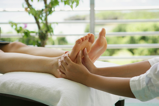 外反母趾は足首のバランスを崩すため、ひざ痛や股関節痛の原因にもなります。60代の女性は外反母趾と股関節痛で通院しています。当院では、こうしたお客さまの足首と姿勢を調整した上で、足指の間を広げて伸ばす「指のば体操」「足首回し」をお教えしています。