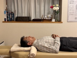 その際、氣仙長生治療院では、やや厚手のタオルを丸めて直径約8cmほどの高さにし、首の下に敷いて仰向けで寝ることをお勧めしています。