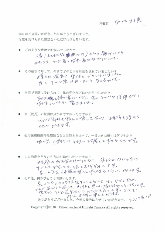 当院に対するご感想をいただきましてありがとうございます。シップをいらない生活を実現された石坂さまはその後、症状が改善され、安定した状態で何よりです。いまは定期的にメンテナンスのために来院されて頂いておりますが、私どもも施術の研鑽を積んでいきたいと思っております。