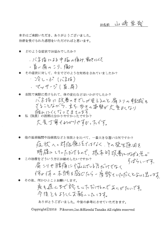お客様の声をありがとうございます。ばね指が、指だけを施術しても改善しない点を理解していただき、姿勢、首、頭を中心に全身を整えながら、施術を進めております。時間がかかりますが、一歩ずつ確実に改善していくと考えております。今後とも痛みがぶり返すことがないようお体のメンテナンスをサポートしていきたいと思います。