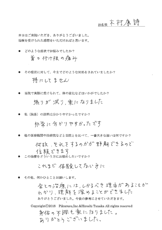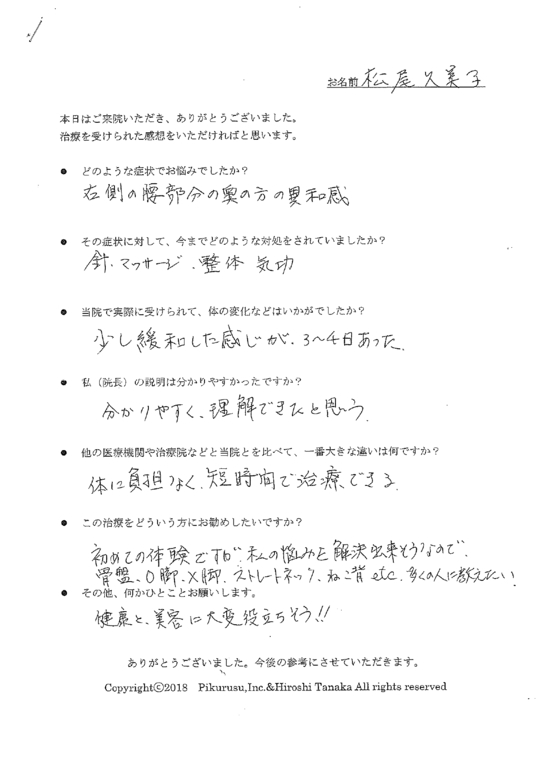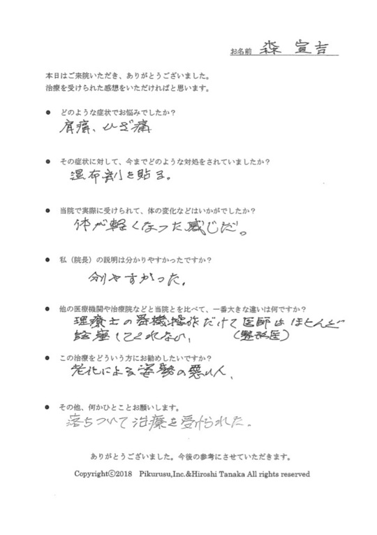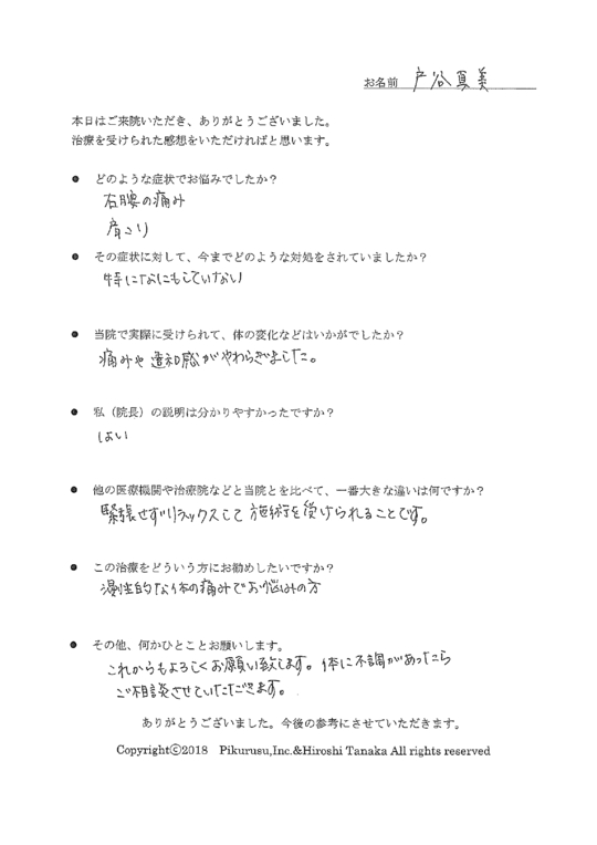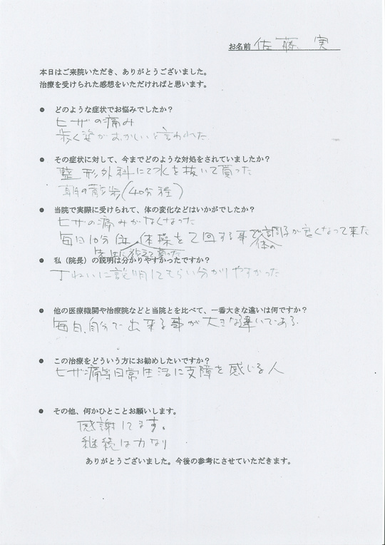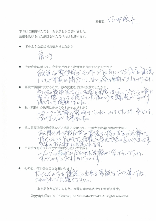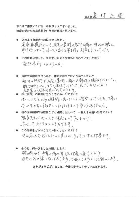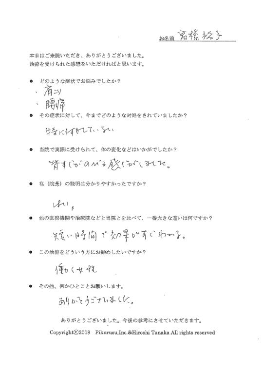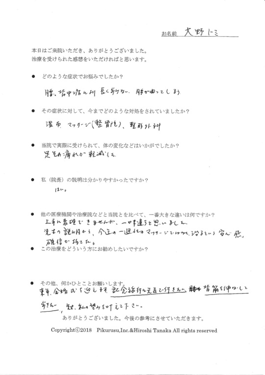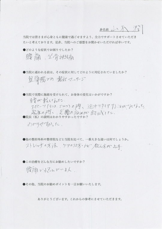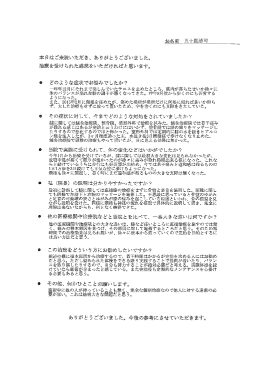 上手に表現できませんが一味違うと思いました。先生の説明から、今までの一過性のマッサージではなく、改善するという安心感、確信が持てた。