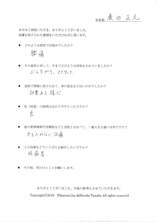 お客様の声を書いていただきましてありがとうございます。廣田さまは、腰痛に加えて、右のお尻から足にかけて痛いという症状を訴えていらっしゃいました。仙腸関節のずれに加えて、坐骨神経痛の症状も顕著でした。骨盤、骨格と筋肉のバランス調整をさせていただき、症状が改善しつつある状況です。