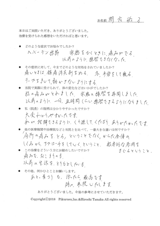 指の痛みがとれました。楽器の練習を再開しました。以前のように、一日、五時間くらい練習できるようになりました。