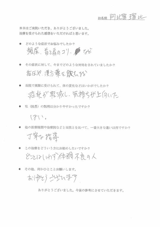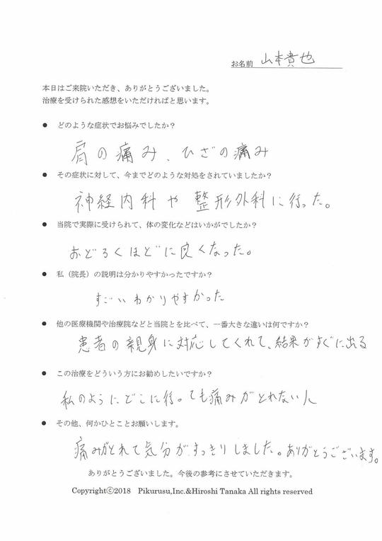 お客様の声をいただきましてありがとうございます。山田様は、医学的な知識が豊富で、ご自身の体の状態や症状を良く分かっていらっしゃいます。私どもも検査に基づいた詳しいご説明と、より精度の高い施術をご提供したいと思っております。今後ともよろしくお願いいたします。