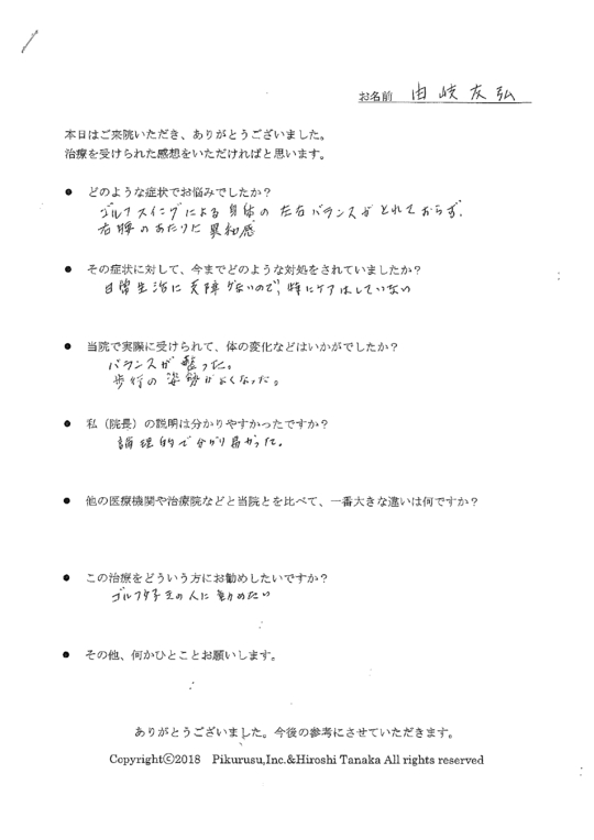 お客様の声をいただきましてありがとうございます。ゴルフが上手になりたいと練習されている方がたくさんいらっしゃいますが、まず、姿勢のずれやゆがみを調整することが早道です。由岐様にはそれを分かっていただき、施術をさせていただきました。