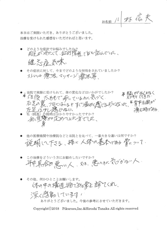 今年1月から施術を受けているが、ひざに関しては最初大きな変化は見られなかったが、就寝中足が痛くて眠りが浅かったのが徐々に痛みが取れ熟睡出来る様になった。これならと続けているうちに歩行にも好影響が出始め、今では若干痛みと違和感は残るものの1日1万歩を3日続けても平気な位に歩けるようになった。頸椎も徐々に回復し、書く時にまだ違和感が残るものの大きな支障は無くなった。