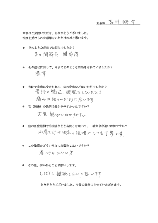 お客様の声を書いていただきましてありがとうございます。へバーデン結節の一般的な治療は間宮さまが書いていらっしゃるように「鎮痛消炎剤をぬる」「冬、手袋をして寝る」「テープをまいて動かさないようにする」といった対応がほとんどです。当院ではそれとはまったく違って積極的に動かすことによって改善を促していきます。間宮さまにも1回目の施術から、改善効果を実感していただけました。今、残っているお悩みは首コリですので、それも改善に向けて全力でサポートしたいと思います。