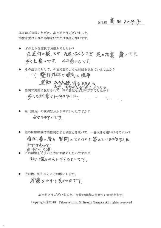3〜4回施術していただいただけなのに、あの激痛は何だったのだろうと不思議な程、痛みや痺れがなくなりました。お陰様で今や毎日数千歩のウォーキングできるようになりました。
