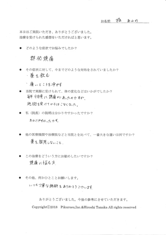 お客様の声を書いていただきましてありがとうございます。6年前から群発性頭痛が辛いということで2019年8月にご来院されました。一回の施術後、何度か目の奥が痛くなるなどの軽い症状が見られたものの、昨夏以来ほぼ9カ月間頭痛なしで過ごされています。頭痛は骨盤、骨格の歪みを正すこと、特に首の骨のズレを調整することが重要です。今はお体のメンテナンスのために月1回程度いらっしゃっていただいておりますが、さまざまな夢を抱いて元気で過ごされていて本当に良かったと思います。