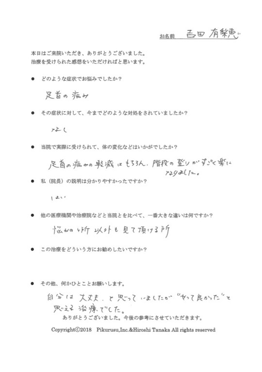 お客さまの声を書いていただきましてありがとうございます。足首が痛くて階段を上がれなかった症状がすぐに改善されて良かったです。症状の原因が足首そのもののゆがみにあり、比較的新しいずれによるものだったようです。今後ともピンポイントで、原因カ所を見極められるよう研修を重ねてまいる所存です。